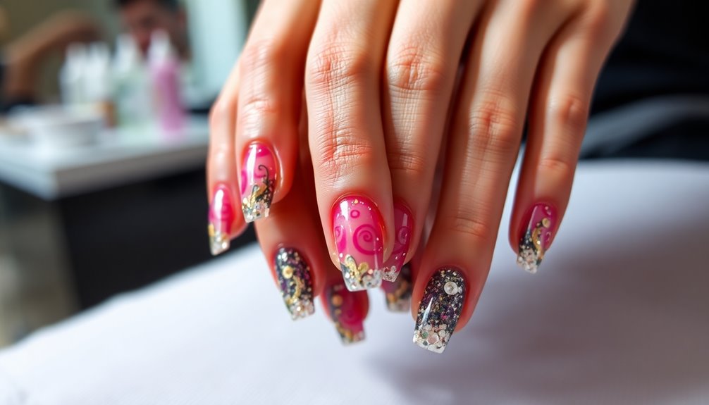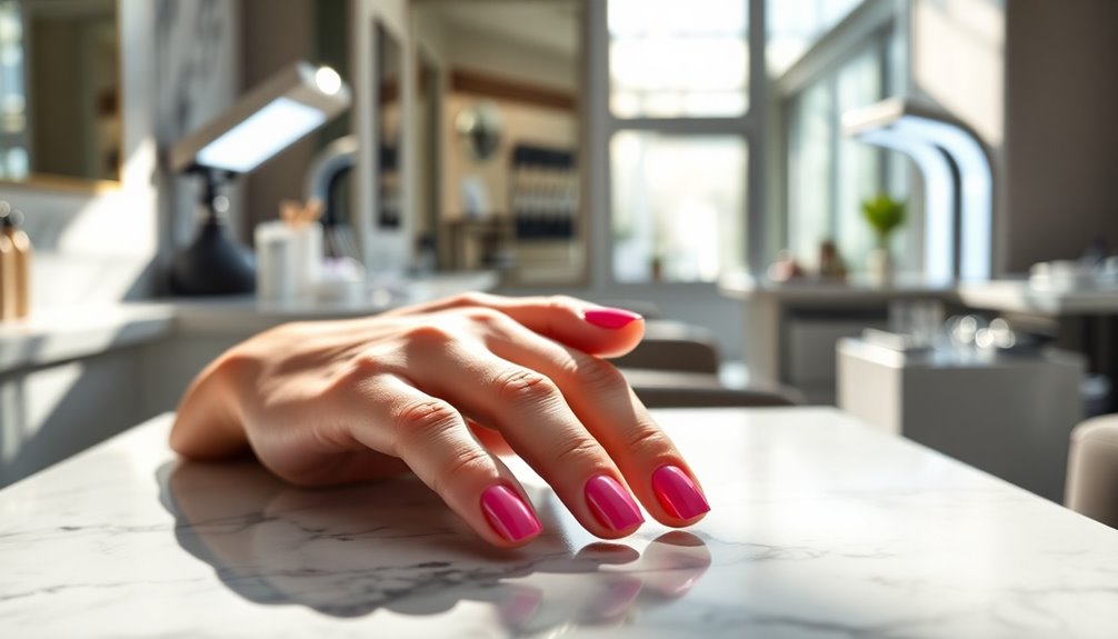 When you get gel nails, you're exposed to UVA radiation from the curing lamps, which can increase your risk of skin cancer over time. While studies show that the risk from gel manicures is lower than direct sunlight, repeated exposure can still damage your skin's DNA. To protect yourself, consider using sunscreen or wearing gloves during your appointments. Additionally, it's important to understand the potential for long-term strategy in minimizing your overall health risks through proactive measures.