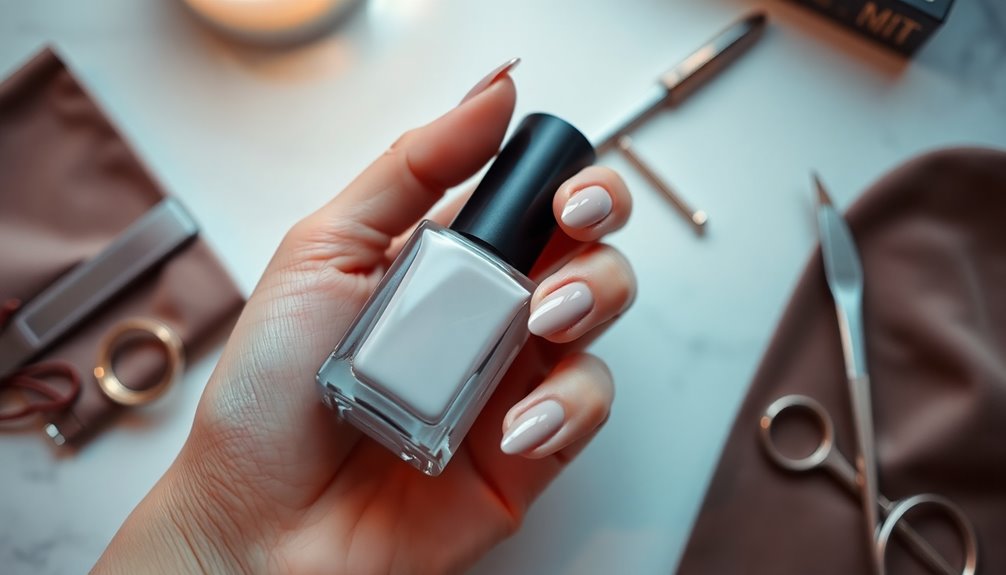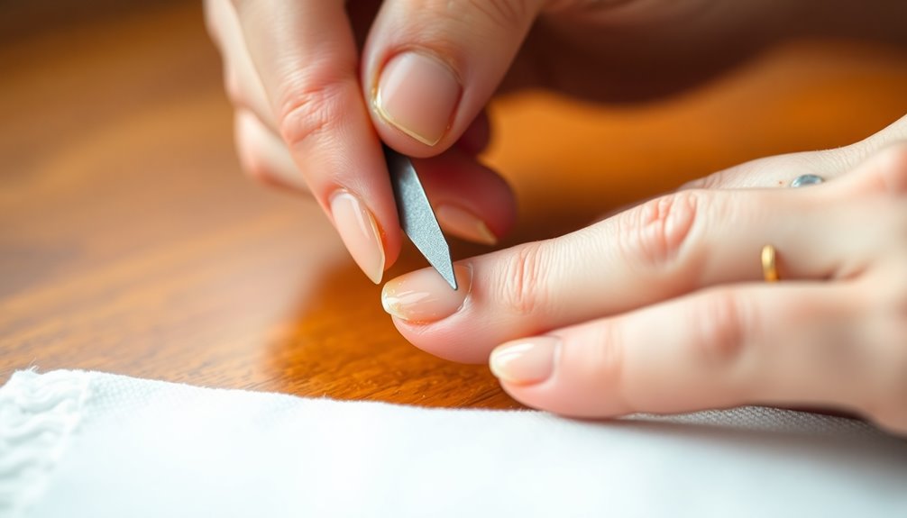 Focus on filing techniques to achieve precision, followed by buffing for a smooth finish. Additionally, consider applying pimple patches to target any blemishes that may distract from your overall look. Finally, let's discuss topcoat application tips to guarantee that your nails look flawless and last longer.