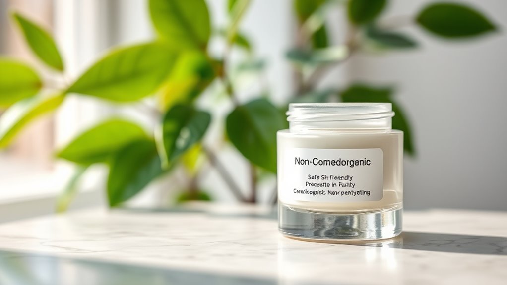 “Non-comedogenic” means a product is designed to reduce the chance of clogging your pores and causing breakouts. It indicates that the ingredients are less likely to block pores, making it a good choice for oily, acne-prone, or sensitive skin. However, it doesn’t guarantee zero breakouts since individual reactions vary and other factors play a role. Understanding what this label truly means can help you make safer skincare choices—discover more about its importance.