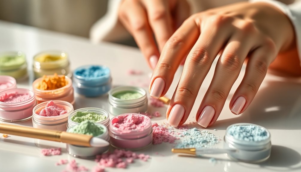 Dip powder nails are an innovative manicure technique combining a bonding agent with pigmented acrylic powder. You'll dip your nails multiple times to get the desired opacity, then finish with a top coat that hardens without needing UV light. This method offers durability and a wide color selection while being gentler on your natural nails compared to traditional acrylics. If you're curious about their benefits, drawbacks, and the application process, keep going for more insights.
