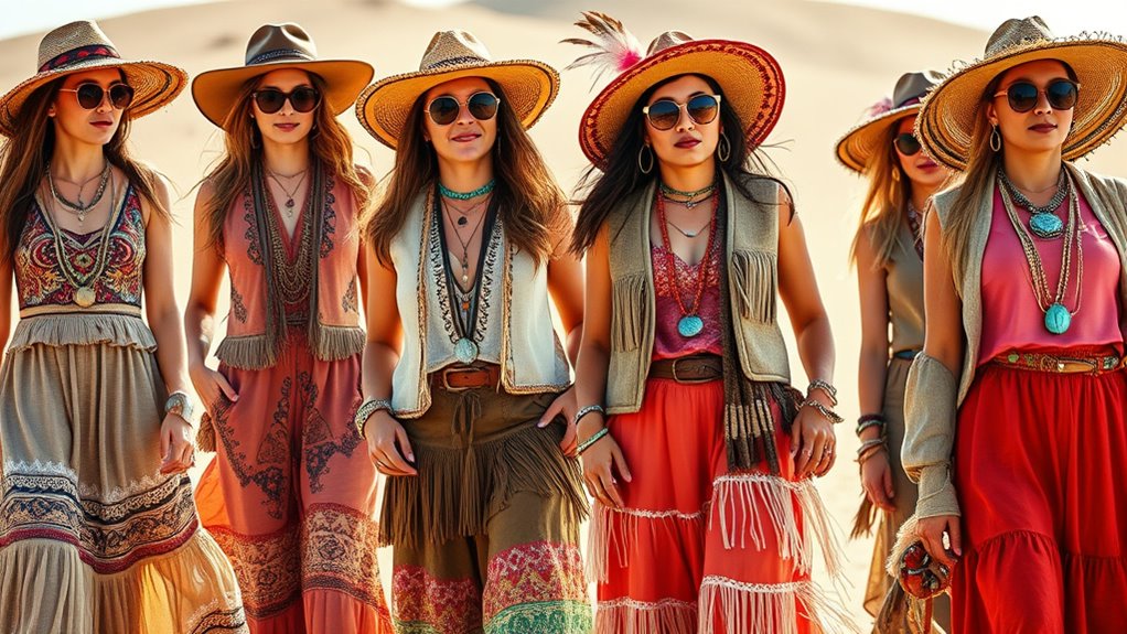Throughout the decades, iconic boho fashion figures like Janis Joplin and Jimi Hendrix of the 1960s embraced free-spirited style with layered jewelry, natural stones, and rebellious attitude. In the 1990s-2000s, celebrities like Sienna Miller and Kate Moss popularized relaxed, eclectic looks filled with flowing fabrics and textured accessories. Today, icons like Vanessa Hudgens and Florence Welch continue to blend vintage charm with modern flair, inspiring you to explore the diverse evolution of boho fashion.