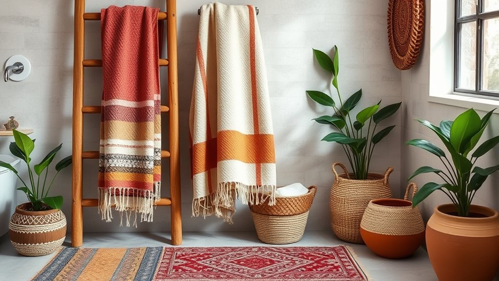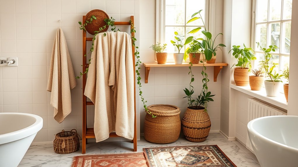 To give your bathroom a fresh boho vibe, layer textured towels in earthy tones and vibrant hues like teal or mustard for tactile interest. Add cozy, patterned rugs with geometric or floral designs in rust or ochre, and incorporate lush greenery with leafy plants like pothos or ferns in natural planters. Mix natural materials with colorful wall decor and statement mirrors to create a warm, eclectic space. Keep exploring for more tips to elevate your boho oasis.