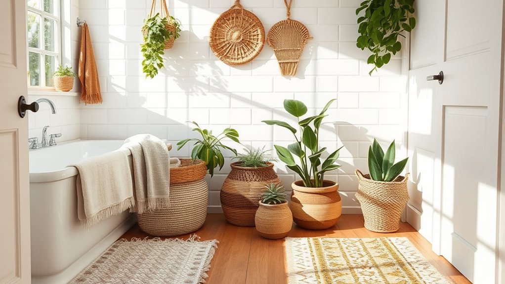 Woven baskets made from natural materials like seagrass, rattan, or jute are perfect for adding both function and style to your boho bathroom. These versatile storage solutions seamlessly blend with boho decor, creating an earthy, textured look. Use different-sized woven baskets on open shelves or the floor to organize towels, toiletries, and laundry while enhancing the room’s warmth. Incorporate baskets with lids to hide clutter and keep your space looking clean and relaxed. Stackable or nested options maximize space efficiency and add visual interest through layered, earthy accents. You can also choose baskets with decorative details like tassels or fringe to amplify the playful, free-spirited vibe that defines boho style, while keeping everything neatly stored. Integrating sound design techniques—such as layering textures and carefully selecting materials—can help you create a cohesive aesthetic that feels both relaxed and thoughtfully curated. Additionally, selecting storage options with expiration awareness can help ensure your bathroom remains functional and clutter-free over time.