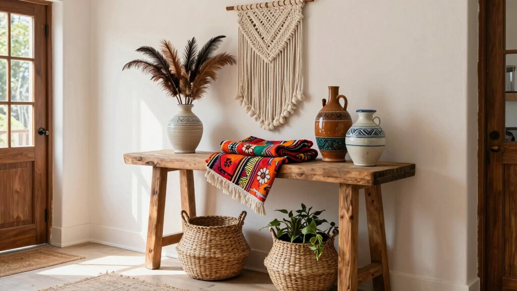 For a boho console table, warm earthy tones like terracotta and mustard work beautifully, creating a cozy vibe. Imagine a space where a mix of textured materials—rattan, reclaimed wood, and woven baskets—complement these colors perfectly. Your color palettes should blend rich hues with natural shades, while material choices add tactile interest. This combination makes your console table inviting and effortlessly stylish, embodying the relaxed, eclectic spirit of boho decor.