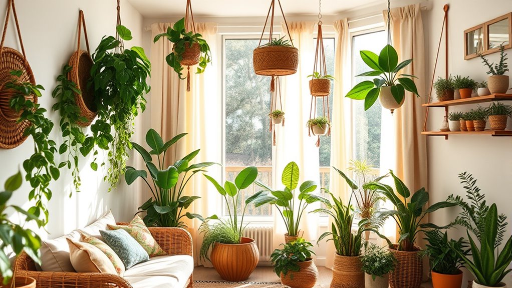 To create a vibrant boho home, selecting the right indoor plants is essential, as they add texture, color, and personality to your space. Focus on plant selection by choosing plant varieties that embody an eclectic aesthetic, like variegated philodendrons, monsteras, and pothos. Trailing plants such as ivy, string of pearls, and pothos bring vertical interest and relaxed vibes, perfect for layered greenery displays. Incorporate diverse plant textures and heights—ferns, alocasia, and succulents—to enhance the tropical, free-spirited feel of boho decor. When choosing plants, consider their plant care needs to guarantee they thrive in your environment. Additionally, understanding vertical storage solutions can help you optimize your space for your lush collection. Incorporating proper lighting is also crucial to support healthy growth and maintain vibrant foliage, ensuring your lush greenery remains thriving and beautiful. Using appropriate watering techniques can further promote healthy, lush growth and prevent overwatering or underwatering. Being aware of nutritional benefits of houseplants, such as improved air quality and mood enhancement, can help motivate consistent plant care and create a healthier indoor environment. Furthermore, selecting plants with adaptability to indoor conditions ensures they flourish regardless of varying light and humidity levels in your home.
