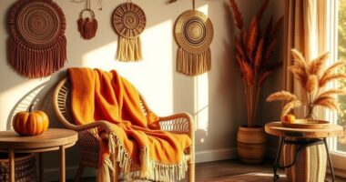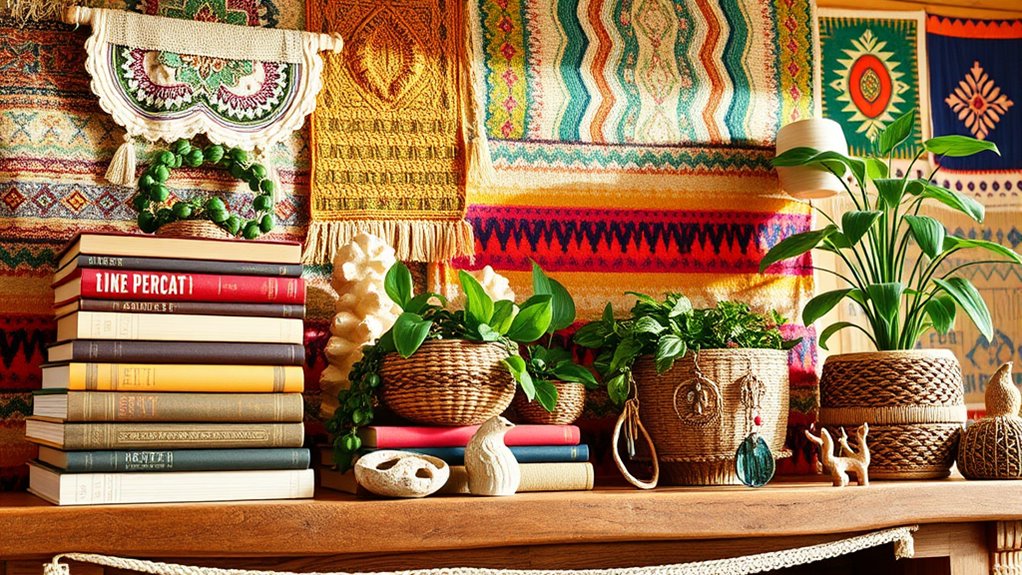 To create a vibrant and textured backdrop, start by selecting a mix of materials like woven baskets, embroidered textiles, and rattan accents that add depth and tactile interest. These elements form the foundation of your layered decor, allowing your boho vignettes to stand out. Incorporate vintage books, stacking them among natural elements like dried flowers, succulents, or variegated foliage to introduce contrast and organic texture. Use a curated color palette with bold or earthy tones such as terracotta, mustard, and teal to unify the display and create visual cohesion. Keep neutral backgrounds like white or beige walls to make the textures and colors pop. This approach results in a dynamic, inviting backdrop that highlights your styling choices while adding warmth and personality to your space. Additionally, considering the use of necessary cookies can enhance your browsing experience as you browse different styling ideas and inspirations. Incorporating themed decor elements further amplifies the boho aesthetic and personalizes your vignette. Being aware of IRA investing strategies can also inspire you to include meaningful collectibles or tokens that reflect your personal journey and interests. Integrating ice cream flavors or other sensory elements can add an unexpected layer of interest and nostalgia to your display. Including driftwood or natural wood pieces can further enhance the organic and earthy feel of your vignette, tying the elements together seamlessly.