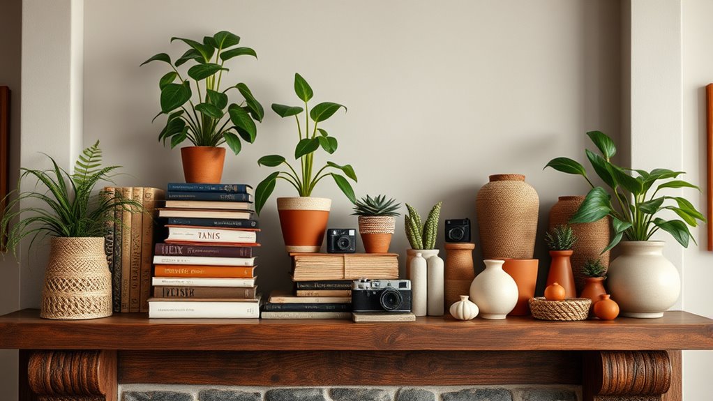 To accessorize a fireplace mantle, you start by choosing a mix of large statement pieces and smaller accents. Incorporate different heights, textures, and shapes to add visual interest. Group accessories in odd numbers for a natural look and place larger items slightly off-center for a relaxed, boho vibe. Regularly update your displays, removing clutter and outdated pieces to keep your mantel fresh and stylish.