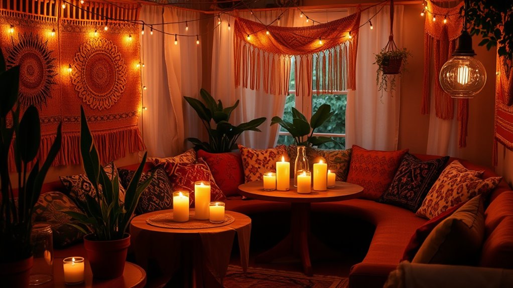 When arranging your candles, think about layering the lighting to avoid harshness. Keep some candles burning softly in the background while others serve as focal points. This layered approach creates a warm, inviting atmosphere that’s perfect for unwinding or entertaining friends. Dim the main lights or switch them off entirely, and let the candlelight and string lights do the work. The flickering flames combined with the twinkling lights evoke a relaxing, almost magical feeling that’s essential for a bohemian retreat. Incorporating grocery savings strategies such as choosing affordable candles and lighting options can help keep your retreat both beautiful and budget-friendly.