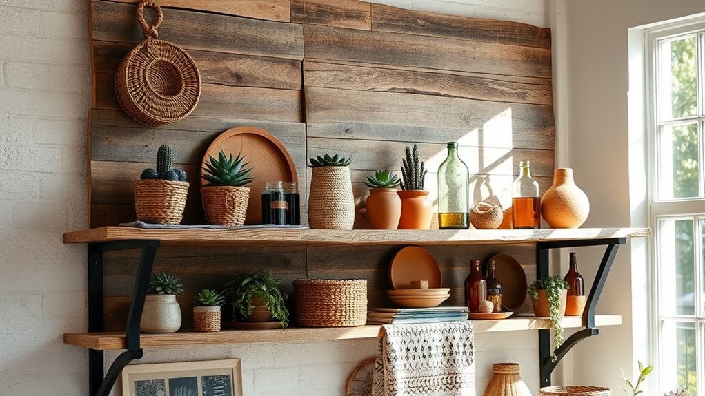 Boho shelving styling combines eclectic decor, natural textures, and vibrant accessories to create a relaxed, inviting space. When you’re designing your shelves, think about how plant arrangements can add life and freshness. Incorporate a variety of greenery—think trailing vines, succulents, or potted herbs—to introduce organic shapes and vibrant pops of color. Place plants at different heights to add visual interest and make your shelves feel lush and layered. This not only brings in a touch of nature but also softens the overall look, making your space feel more welcoming.