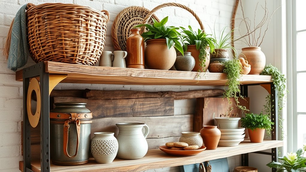To incorporate vintage pieces into boho shelving, start by mixing vintage accents with your existing decor for a curated look. Use antique displays and unique finds as focal points, balancing them with colorful textiles and plants. Place smaller vintage items alongside modern pieces to create contrast. This approach adds character and charm, making your shelving feel personalized and eclectic, perfect for capturing that relaxed boho vibe.