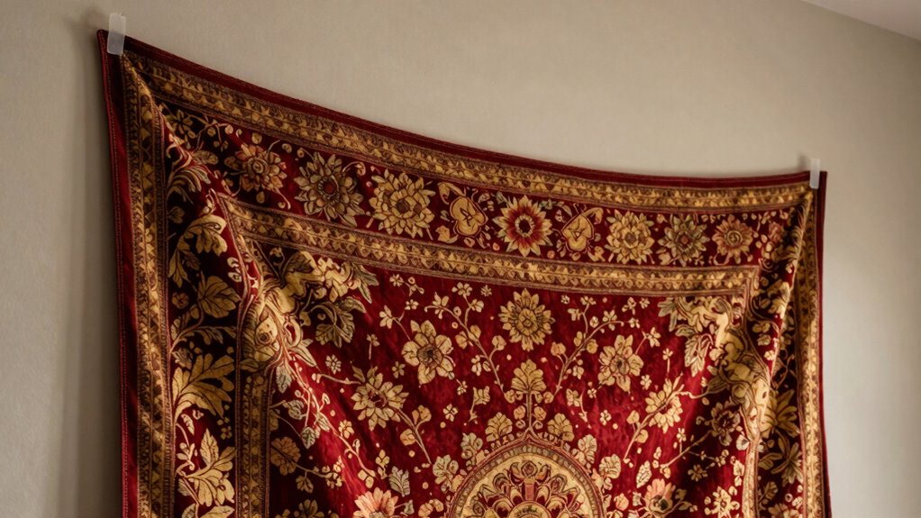 When it comes to installation tools, having the right equipment makes all the difference. You’ll want some basic tools like a measuring tape, level, and a pencil for marking placement. For hanging, adhesive hooks or strips are great because they’re damage-free and remove cleanly when you decide to change your decor. If you prefer a more secure hold, you might opt for tension rods or removable mounting strips designed for heavier fabrics. For heavier tapestries, using small nails or picture hangers can work, but you should be cautious and use removable options to avoid wall damage. Always make sure you’re selecting the proper hooks or nails based on the weight of your tapestry and the type of wall surface—drywall, brick, or plaster.