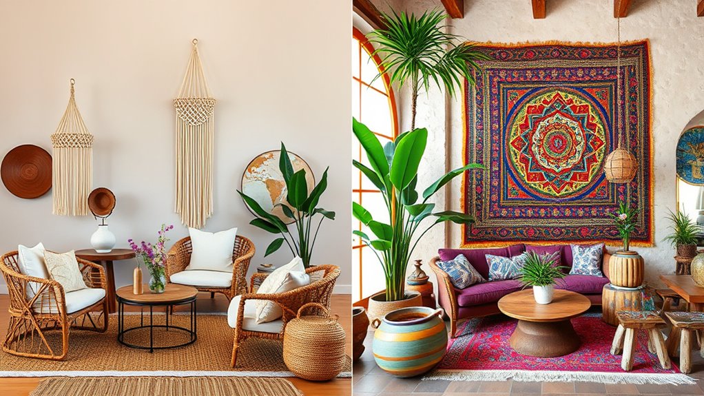 If you’re choosing between neutral and maximalist boho styles, think about the vibe you want. Neutral boho creates a calm, airy space with soft tones, subtle patterns, and natural textures, perfect for relaxation. Maximalist boho is lively and bold, mixing vibrant colors, eclectic decor, and layered textiles to showcase personality. Both let you express yourself uniquely. Curious about how to balance these styles or create your perfect space? Keep exploring to discover more tips.