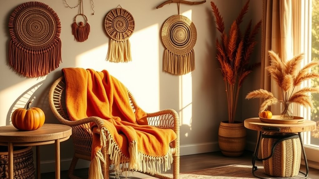 Incorporating textured accessories and fall-inspired arrangements brings tactile richness and seasonal warmth to your boho decor. You can enhance your space by adding elements that evoke autumn’s natural beauty and create visual interest. Consider these key items: