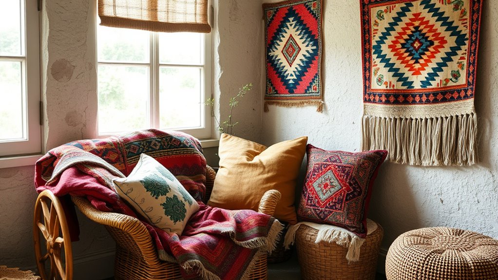 Textiles play a pivotal role in shaping the cozy, inviting atmosphere that defines boho decor. By layering textiles like blankets, pillows, and tapestries, you create a rich, tactile environment that feels warm and welcoming. Mix textures such as velvet, linen, and faux fur to add visual depth and sensory interest. Incorporate a variety of patterns and colors to craft an eclectic look that reflects your personality. Tapestries and woven wall hangings serve as focal points, bringing warmth and bohemian charm to your walls. Thoughtful placement of layered textiles enhances comfort and softness, transforming your space into a relaxed, inviting retreat. Ultimately, these textiles help you achieve that signature layered, cozy atmosphere essential to authentic boho decor.