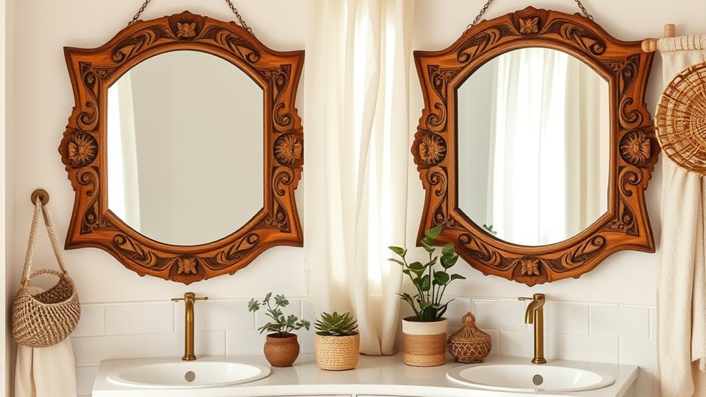 Curated decor and fixtures can instantly elevate your boho bathroom, blending style and functionality effortlessly. A standout bathroom mirror with a wood frame adds warmth and natural texture, setting the tone for your space. Consider a vintage mirror to bring a touch of rustic charm, or opt for a mounted mirror with an intricate wooden frame for a more refined look. These mirrors serve as both functional fixtures and eye-catching decor elements. Incorporate quality craftsmanship to ensure your fixtures stand the test of time and maintain their aesthetic appeal. Complement your selection with accessories like lanterns, ruffled curtains, and copper fixtures from sources like Magnolia Home or Pottery Barn. This curated approach creates a cohesive, cozy vibe that balances modern boho with rustic charm, transforming your bathroom into a curated sanctuary that’s both stylish and inviting. Incorporating self-watering planter pots into your decor can also add a unique, eco-friendly touch, blending greenery with your curated aesthetic. Paying attention to durability and safety in your fixtures ensures your space remains beautiful and functional over time. Additionally, understanding IRA tax implications can help you plan your investments wisely, ensuring your financial health supports your home beautification goals.