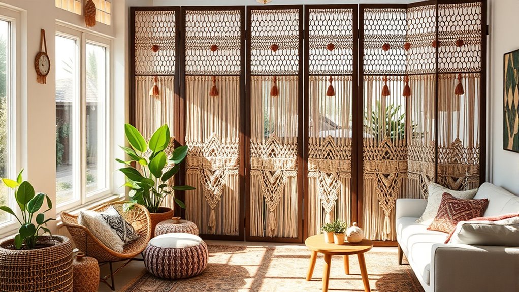 Another advantage is that these screens are easy to customize. You can build DIY dividers with a mix of fabrics, beads, or even hanging plants to create a more personalized boho vibe. They’re typically lightweight, so you can experiment with different arrangements until you find what works best. Whether you prefer a semi-private corner for relaxing or a partition that separates your workspace from the rest of the room, decorative dividers give you the freedom to craft a space that feels both open and intimate. Additionally, incorporating soundproofing materials can further improve privacy and acoustics within your space. Using color accuracy in your decor choices can also enhance the overall vibe by creating a harmonious environment that reflects your personality.