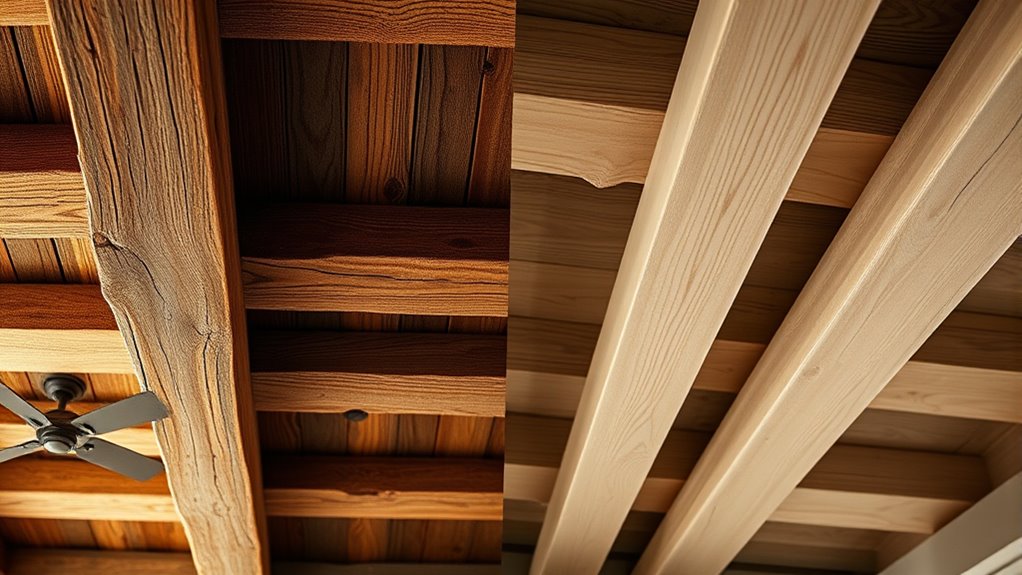 Real wood beams have a natural authenticity that faux options often can’t replicate. When you opt for real beams, you’re investing in genuine wood, which means you’ll have the opportunity to customize them through wood staining. Wood staining allows you to highlight the natural grain, deepen the color, or even alter the tone to match your decor. This process can be done during beam installation or afterward, giving you flexibility in achieving the exact look you want. Installing real beams involves attaching solid wood to the ceiling structure, which requires precise beam installation techniques. The process can be more labor-intensive and costly upfront, but it results in a durable, genuine feature that ages beautifully over time. Additionally, real beams can be sanded, refinished, or stained again if you decide to change your interior style later.