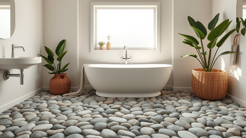 You might wonder if pebble floors suit underfloor heating. Absolutely, they do, especially when you choose pebble color options that complement your style. To keep your pebble floor looking great, follow pebble maintenance tips like sealing regularly and avoiding harsh cleaners. Underfloor heating warms the stones evenly, creating cozy comfort. So, yes, pebble floors work well with heating systems, providing both beauty and warmth in your bathroom sanctuary.