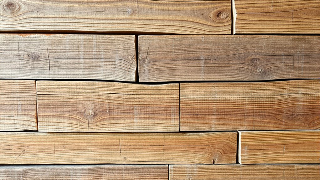 You might wonder if reclaimed wood can handle damp or humid environments. While it’s eco-friendly and has a lower environmental impact, reclaimed wood typically isn’t naturally moisture-resistant. To improve its durability, you should treat it with sealants or finishes designed for high humidity. Proper sealing enhances moisture resistance, helping preserve the wood and maintaining its beauty over time, even in challenging environments.