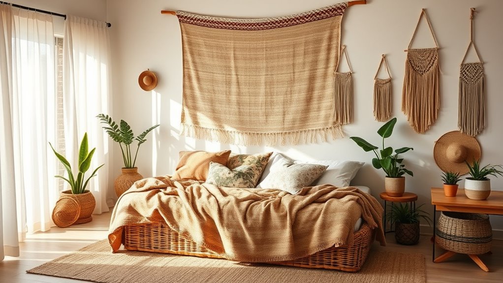 Incorporating natural fiber textiles like jute, hemp, and seagrass rugs immediately brings earthy textures and sustainable appeal to your boho bedroom. These textiles add visual warmth and eco-friendly charm. To enhance the cozy environment, consider: