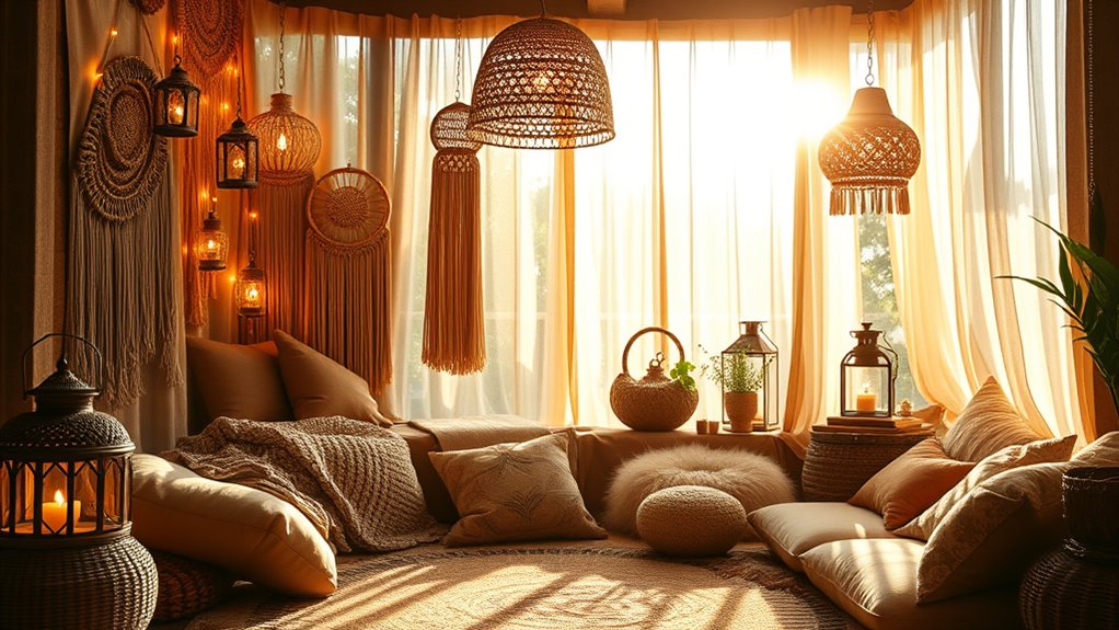 Embracing natural materials ensures your lighting enhances the authentic, eco-conscious vibe of your boho sanctuary.