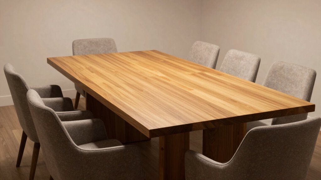 Did you know that solid hardwood tables can last over 50 years with proper care? For durability, choose materials like oak, maple, or walnut, which withstand daily table maintenance better than softer woods or veneers. In a material comparison, these hardwoods resist scratches and dents, making them ideal for busy households. Investing in a sturdy material guarantees your dining table remains beautiful and functional for generations to come.