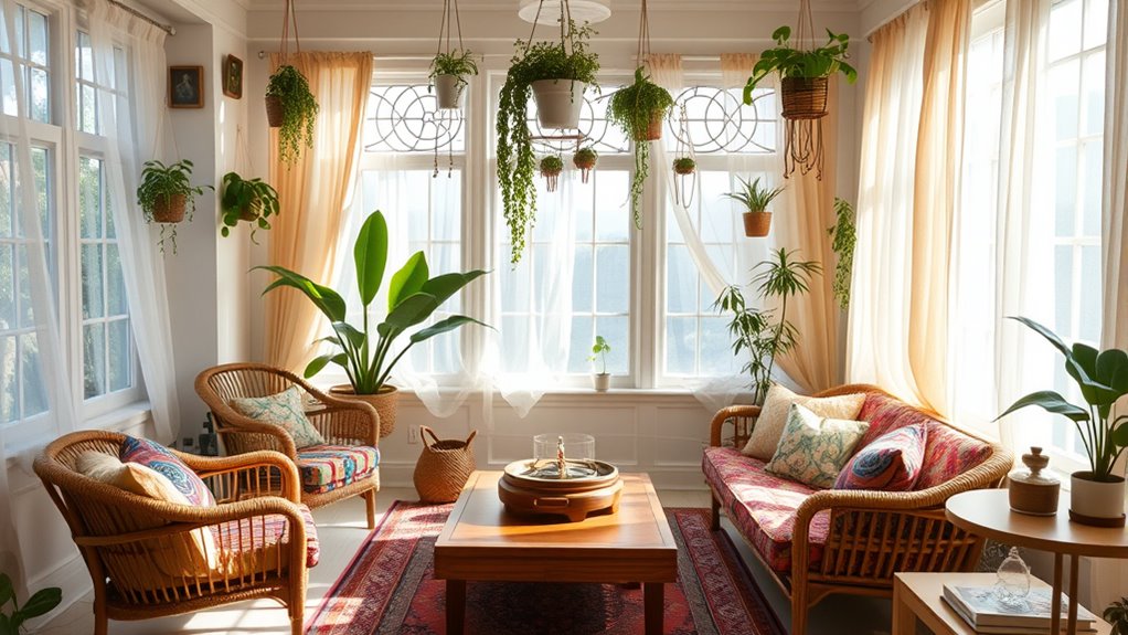 You might wonder which colors boost both feng shui and boho style. Earth tones like warm browns and terracotta promote aesthetic harmony and symbolize stability. Soft blues and greens bring calming energy, aligning with feng shui principles. Bright accents like vibrant reds or yellows add lively touches typical of boho. By choosing colors with meaningful symbolism, you create a balanced, harmonious space that reflects both styles seamlessly.