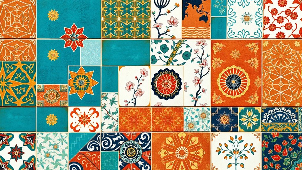 To start, focus on understanding the concept of pattern harmony. It’s about balancing different motifs, colors, and textures so they complement each other rather than compete. Think of it as a conversation between patterns rather than a shouting match. For example, pairing a bold, geometric African print with a subtle, intricate Asian motif can work beautifully if you keep the color palette consistent or harmonized. Muted tones or monochromatic schemes can unify contrasting patterns, preventing visual overload. You want each pattern to stand out on its own but also to contribute to a harmonious whole. Incorporating visual balance principles can further enhance this harmony by guiding how elements are distributed within the space.