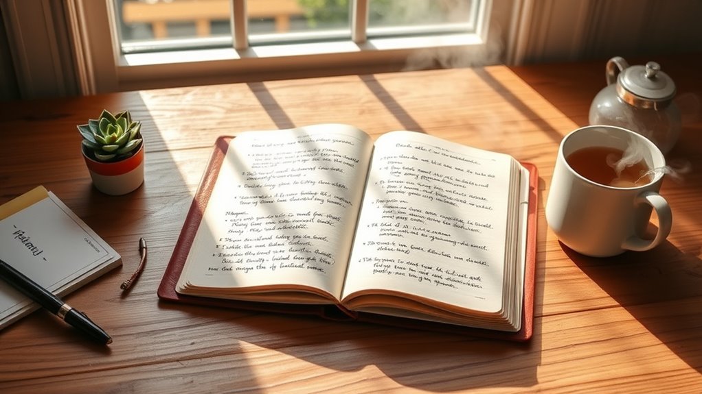 Staying motivated to journal regularly starts with habit formation. Set aside a consistent time each day, making it a natural part of your routine. Use creative techniques like doodling or prompts to keep things fresh and engaging. Remind yourself of the benefits, such as clarity and stress relief. As you see progress, your motivation will grow, turning journaling into an enjoyable, integral habit that supports your goals.