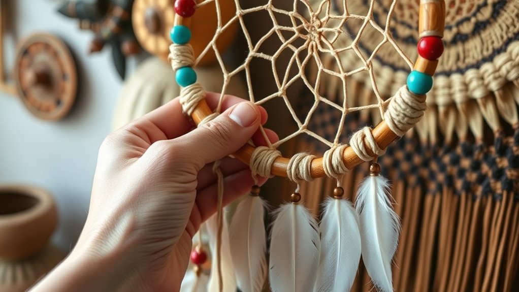 Have you ever wondered how to create a beautiful dreamcatcher while honoring its cultural origins? If so, it’s essential to approach this craft with respect for Native traditions and a mindful awareness of ethical sourcing. Dreamcatchers are not just decorative items; they carry deep cultural significance rooted in Indigenous beliefs. To truly honor this, start by educating yourself about their history and meaning within Native communities. Understanding that dreamcatchers originated with the Ojibwe and Lakota peoples helps you appreciate their spiritual importance and ensures your craft respects that heritage.