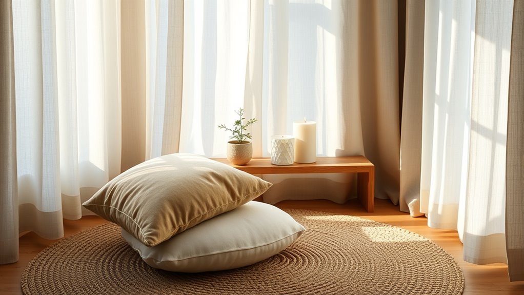 Position your cushions thoughtfully to maximize comfort and accessibility. Place them on a low platform or directly on the floor, depending on your preference. *Guarantee* the space is free of clutter, so your mind isn’t distracted by chaos. A simple, clean environment supports mindfulness and keeps you focused on your breathing and meditation practice. You might also add a small side table for personal items like a journal, a water glass, or a timer to keep your session organized.