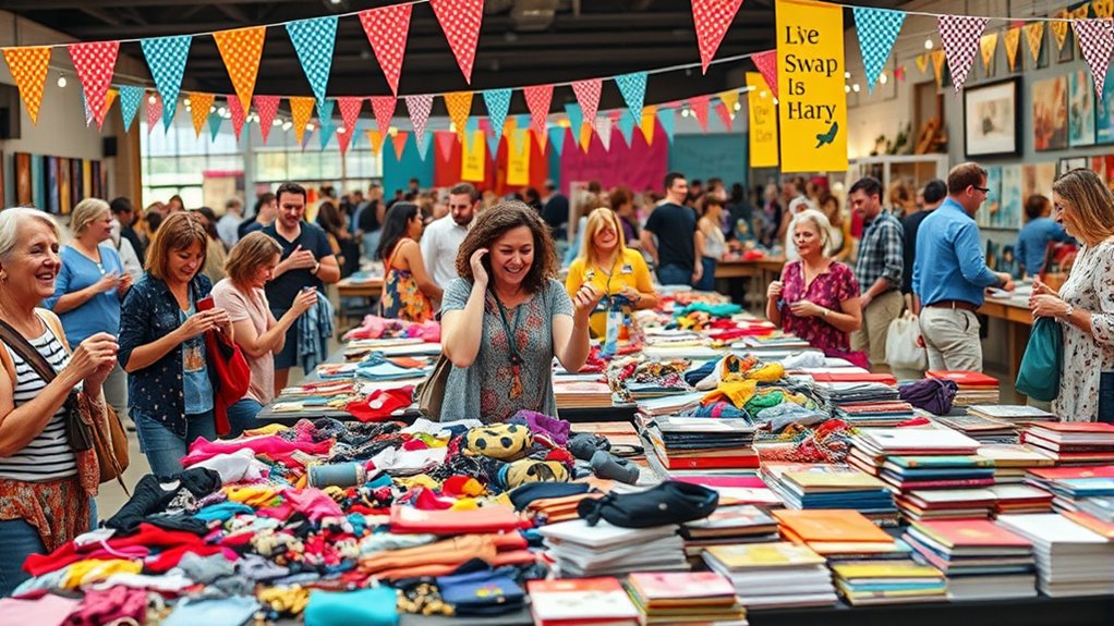 To organize a successful swapping party, choose a fun and engaging theme that reflects your community’s interests, and clearly communicate it to guests. Set up designated areas for different items, encourage guests to bring clean, good-condition items, and remind them to label their belongings. Create a friendly atmosphere with snacks and visuals, and be ready to facilitate conversations and exchanges. Following these tips will guarantee everyone has a great experience—and there’s more to discover on hosting smooth, memorable swap events.