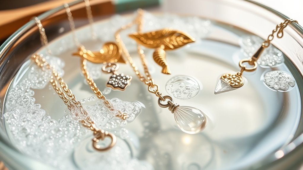 When cleaning jewelry yourself, you should avoid using harsh chemicals or abrasive materials, as they can cause chemical reactions or abrasive damage. Steer clear of bleach, ammonia, or baking soda on delicate pieces, and don’t scrub too hard. Instead, opt for gentle cleaning methods, like warm water and mild soap, to protect your jewelry’s finish and prevent any long-term harm. Always test on a small area first.