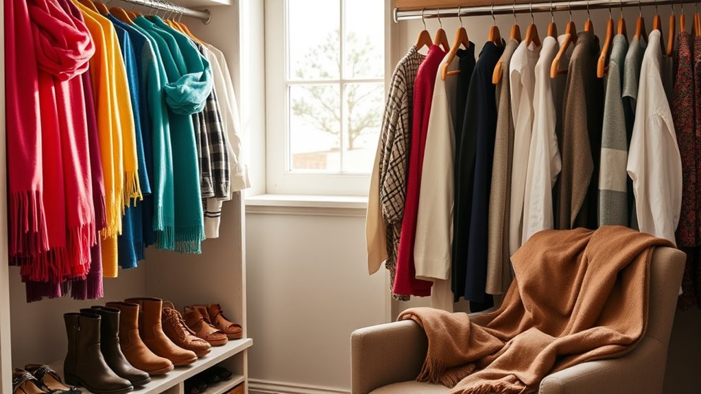 Additionally, consider your color palette and patterns to keep your wardrobe fresh and exciting for each season. Lighter colors and floral patterns are great for spring and summer, while darker shades and textured fabrics suit fall and winter. By thoughtfully selecting layering techniques and fabric choices, you’ll create a wardrobe that’s not only cost-effective but also perfectly tailored to the changing weather. This approach helps you stay comfortable, stylish, and prepared no matter what the forecast brings.