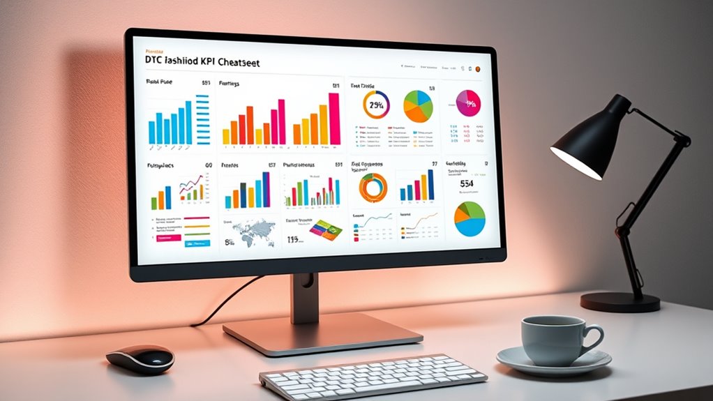 A KPI cheat-sheet for DTC fashion labels highlights key metrics like customer acquisition cost (CAC), conversion rate, repeat purchase rate, customer lifetime value (CLV), and Net Promoter Score (NPS). These KPIs help you evaluate marketing efficiency, boost customer loyalty, and optimize operations. Tracking these indicators regularly gives you a clear picture of your brand’s health and growth potential. Keep exploring to discover how to leverage these metrics for sustained success.