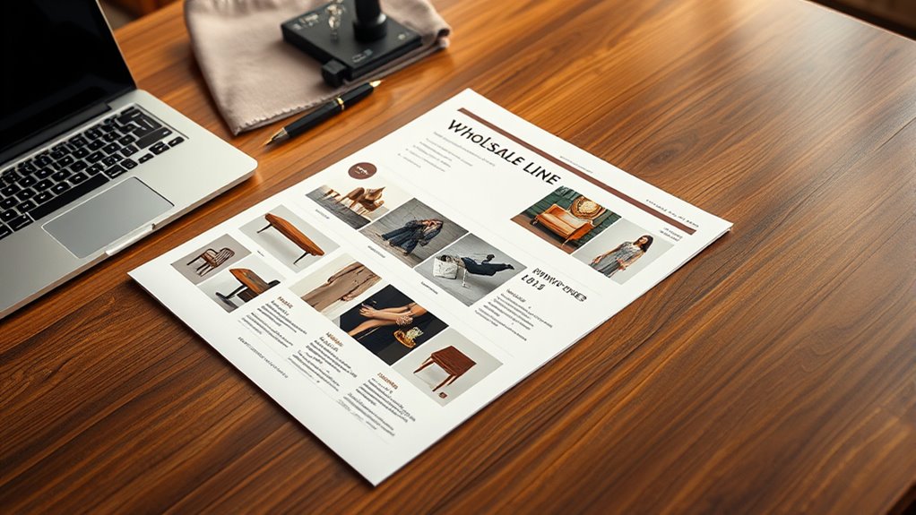To create wholesale line sheets that sell, focus on clear, attractive visuals and organized product details that highlight what makes your offerings unique. Use consistent branding to build trust and include transparent pricing to entice buyers. Craft compelling descriptions and layout designs that emphasize quality and benefits. A professionally designed line sheet serves as a persuasive marketing tool that opens new doors and encourages ordering. Keep exploring for expert tips to make your line sheet even more effective.