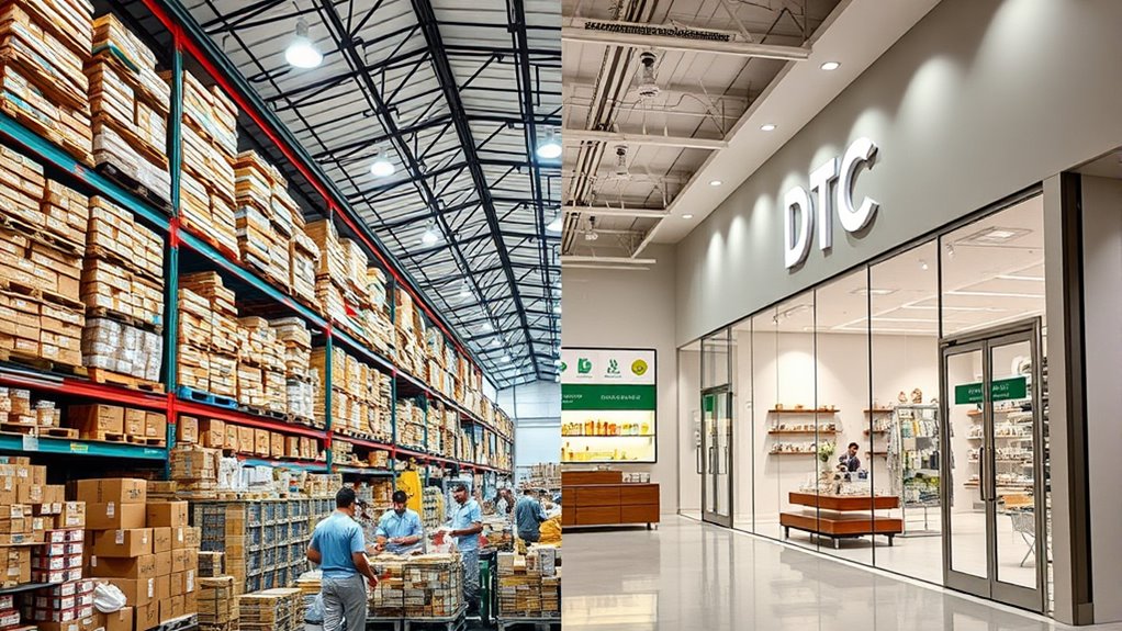 Choosing the right mix between wholesale and DTC depends on your goals. Wholesale offers steady revenue and rapid market expansion through bulk sales, while DTC provides valuable customer insights and higher margins via personalized offerings. A hybrid approach lets you balance broad reach with strong customer relationships. To make the most of both channels and optimize your growth, explore how blending them can align with your long-term strategy. Keep going to discover more tips and insights.