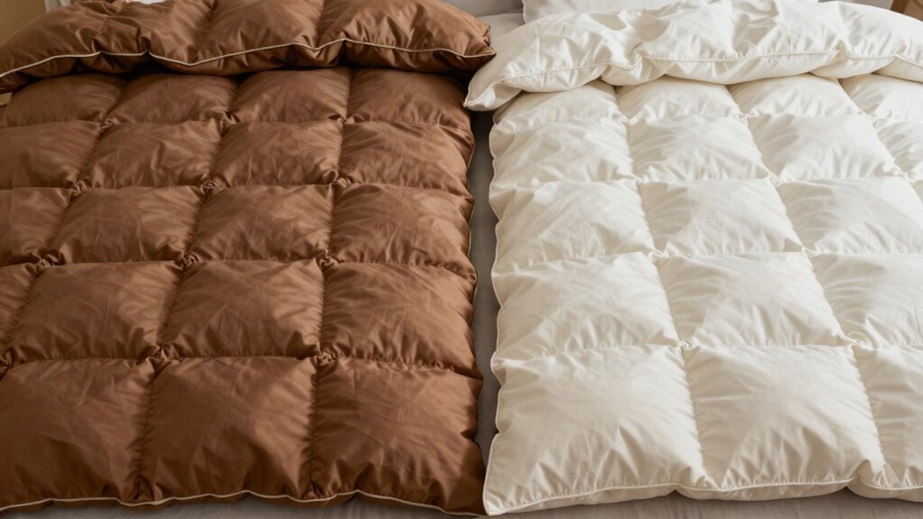 Have you ever wondered what truly sets down and down alternative comforters apart? The difference comes down to a few key factors, especially when it comes to insulation longevity and allergen sensitivity. Down comforters are renowned for their exceptional warmth-to-weight ratio, meaning they provide cozy insulation without feeling heavy. The natural down clusters trap air efficiently, offering long-lasting insulation that maintains its loft over time. If you want a comforter that stays fluffy and insulating for years, down is hard to beat. However, this longevity depends heavily on proper care—over time, down can flatten or clump if not maintained properly, which diminishes its insulation properties. That’s why investing in a high-quality down comforter and following care instructions is vital if you want durability.