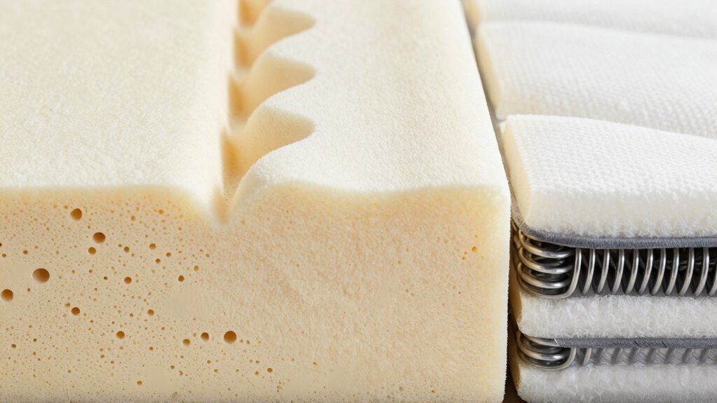 The feel and firmness of latex, memory foam, and hybrids vary considerably, affecting how you experience comfort and support. Latex tends to offer a resilient, slightly bouncy feel with a firmer perception, providing good support and a balanced firmness perception. Memory foam feels softer initially, contouring closely to your body, which enhances pressure relief but may feel less supportive for some. Hybrids combine the firmness perception of innerspring support with foam’s pressure relief, resulting in a balanced feel.