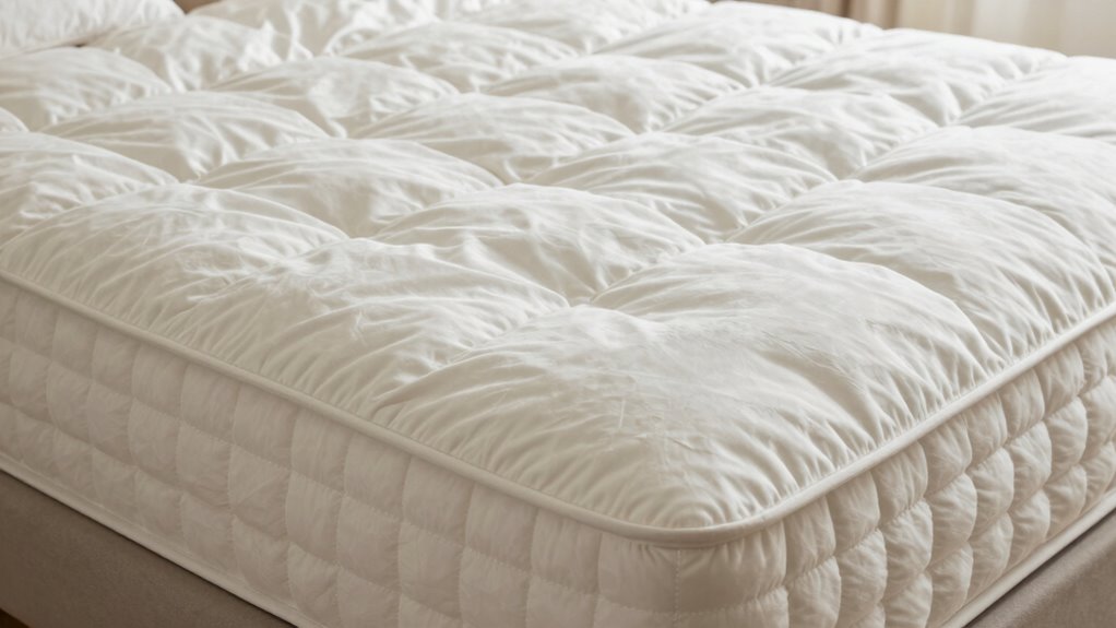 Choosing the right sleep surface is also essential, as it directly affects the overall comfort and support you experience. Support is essential for a restful sleep, and it’s closely tied to the materials used. Look for toppers made from high-quality memory foam, which conforms to your body’s shape and distributes weight evenly. Additionally, choose options crafted from hypoallergenic materials, especially if you have allergies or asthma. These materials resist dust mites, mold, and other allergens, ensuring a healthier sleeping environment. Proper ventilation is also important to prevent heat buildup, especially with dense foam toppers, and many hypoallergenic toppers also use breathable covers that wick away heat and moisture, preventing overheating and promoting cooler sleep.