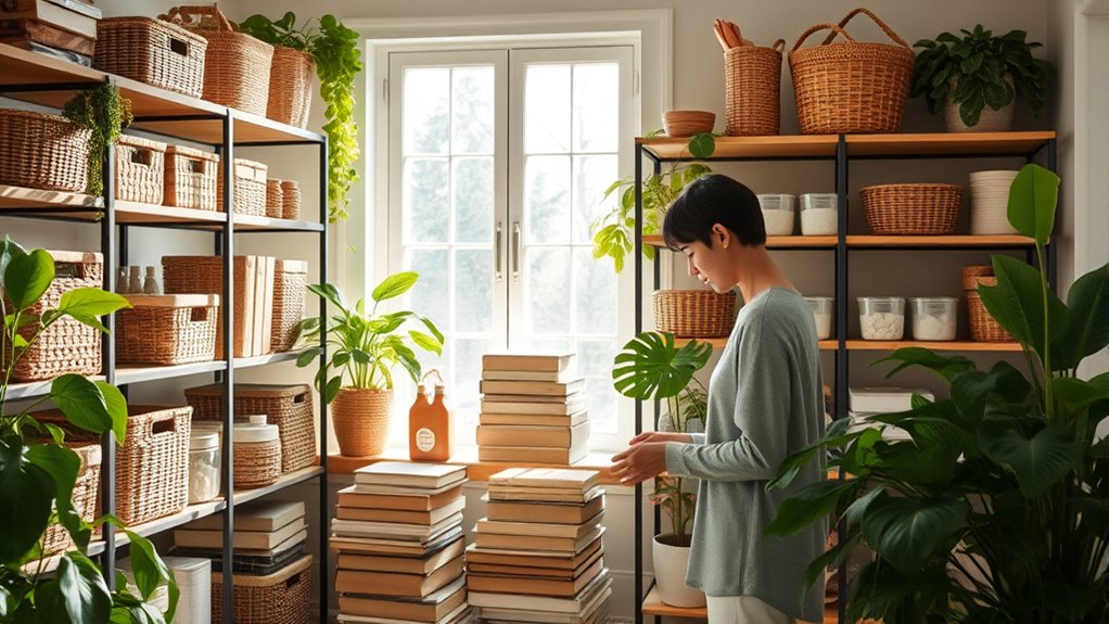 You can declutter without creating waste by adopting a minimalist mindset, focusing on keeping only what you truly need and love. When deciding what to let go, donate or sell items in good condition, rather than throwing them away. Practice eco-conscious shopping moving forward to prevent unnecessary clutter. This approach helps reduce waste, supports sustainability, and keeps your space organized with meaningful possessions.