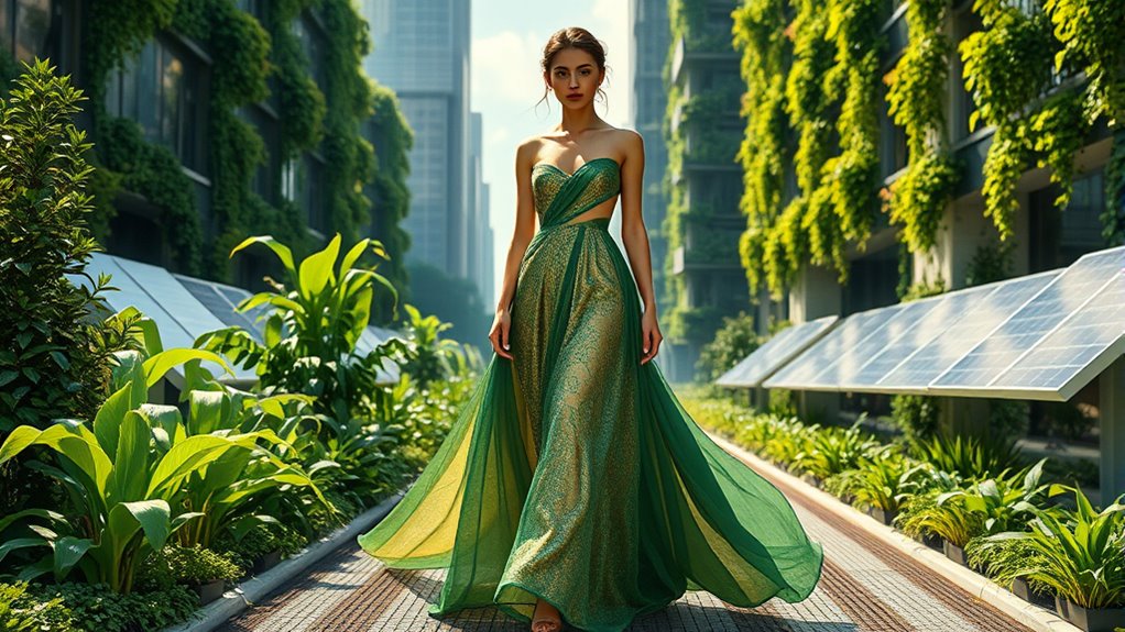 The future of fashion is all about innovations in green design. You’ll see brands using eco-friendly materials like organic cotton and ethical wool, while embracing sustainable practices such as circular fashion and garment rentals. Advanced technology helps optimize supply chains and improve manufacturing efficiency. Plus, the rise of eco-conscious consumers, especially Gen Z, is pushing the industry toward more sustainable choices. Keep exploring to discover how these trends are shaping a greener wardrobe for everyone.