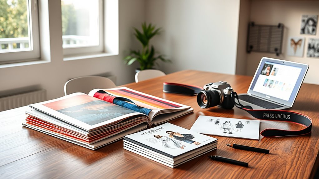 You should start preparing your press kit at least 6 to 8 weeks before your fashion show. Timing considerations are vital to guarantee you have enough time for thorough preparation. Create a preparation checklist that includes gathering high-quality images, writing compelling bios, and designing an engaging layout. Starting early allows you to refine your materials, make necessary adjustments, and avoid last-minute stress, guaranteeing a polished and professional presentation.