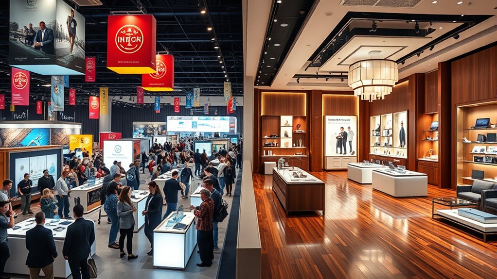 Trade shows and showrooms differ mainly in environment, purpose, and engagement. At trade shows, you encounter a bustling, visually driven atmosphere designed to attract a broad audience quickly and generate buzz. In contrast, showrooms offer a relaxed setting where you can connect more deeply, explore products hands-on, and build trust. By understanding these differences, you’ll better select how to showcase your products effectively—stay tuned to discover even more insights.