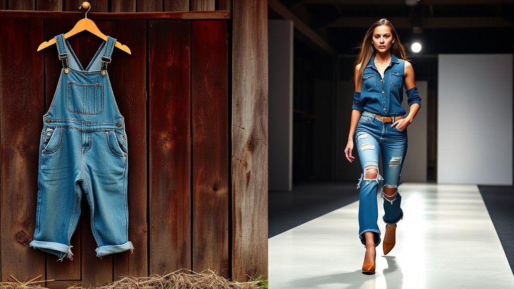 Denim’s journey from sturdy 17th-century workwear to a fashion runway staple is fascinating. It started in France, designed for durability, before Levi Strauss modernized it into jeans in 1873. Hollywood icons like James Dean cemented denim’s status as a symbol of rebellion. Today, luxury brands like Gucci showcase innovative designs, transforming denim into high fashion. This evolution reflects shifting cultural trends and personal expression. There’s so much more to explore about denim’s impact on fashion.
