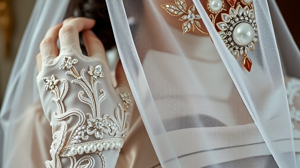 You should follow fabric care and cleaning tips to keep your accessories looking their best. For delicate gloves, gently hand wash in cool water with mild soap, then air dry. Veils and headpieces often require careful spot cleaning or professional dry cleaning to avoid damage. Always check any care labels for specific instructions, and store accessories in a cool, dry place to maintain their shape and quality.
