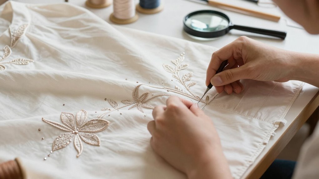 Proper ventilation considerations also help preserve the integrity of handcrafted garments by preventing moisture buildup that could compromise delicate fabrics. These details demonstrate the artisan’s skill and dedication. Spotting consistent seam finishing and proper hem reinforcement helps you distinguish couture-quality handwork from mass-produced pieces, ensuring you appreciate the true craftsmanship behind each garment.