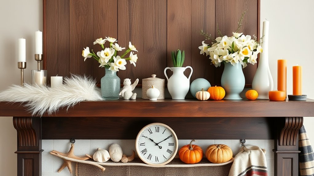 Think of your mantel as a canvas waiting for a fresh coat of paint each season. You can easily update it on a budget by swapping out DIY accents that match your new color schemes. Use everyday items like candles, framed photos, or even fabric to create a fresh look without spending a fortune. This approach keeps your space lively and reflects the changing seasons without breaking the bank.
