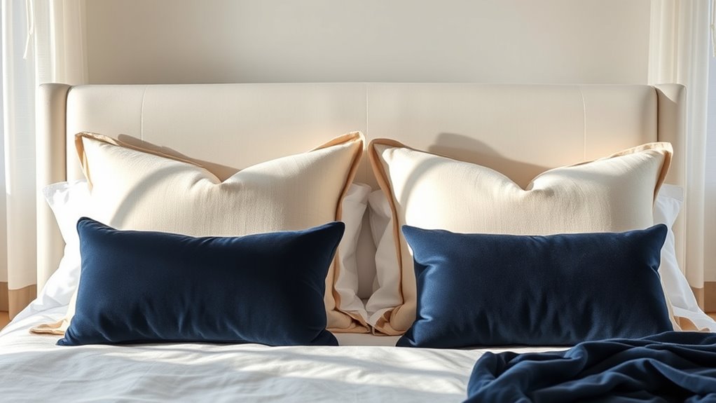 Different pillow shapes considerably impact the 2-4-1 styling approach by creating contrast and enhancing visual balance. You’ll want to mix shapes like squares, rounds, and rectangles to add interest and prevent a monotonous look. Using contrasting pillow shapes helps draw attention and keeps the arrangement dynamic. To achieve a harmonious display, balance larger pillows with smaller or differently shaped ones, ensuring the overall aesthetic feels cohesive and inviting.