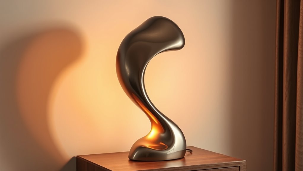 Sculptural lamps transform lighting into functional art that elevates any space you choose. By blending bold design with practical illumination, they become focal points that enhance your interior’s style. You can explore various materials like metal, glass, or wood to match your aesthetic, while lighting techniques such as direct or indirect light create mood and depth. Keep exploring how to select and incorporate these artistic fixtures to bring your room to life.